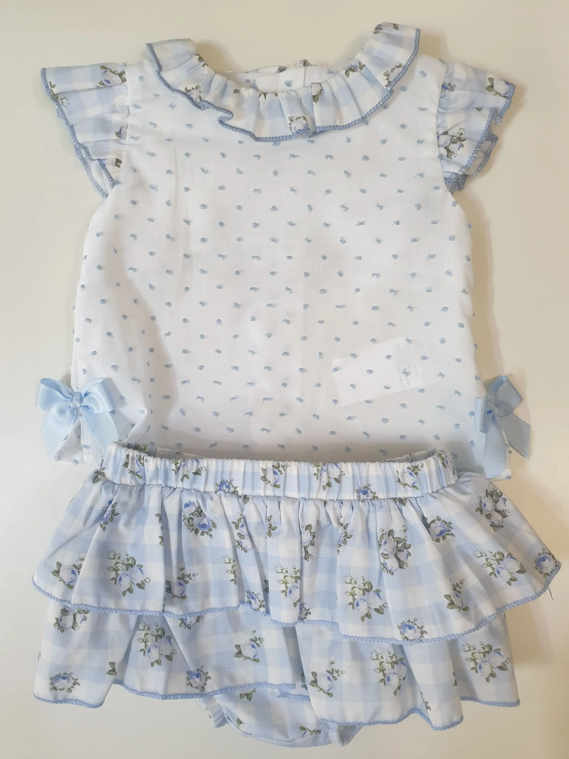 Conjunto dos piezas en tonos celeste de blusa y faldita con cubrepañal.
