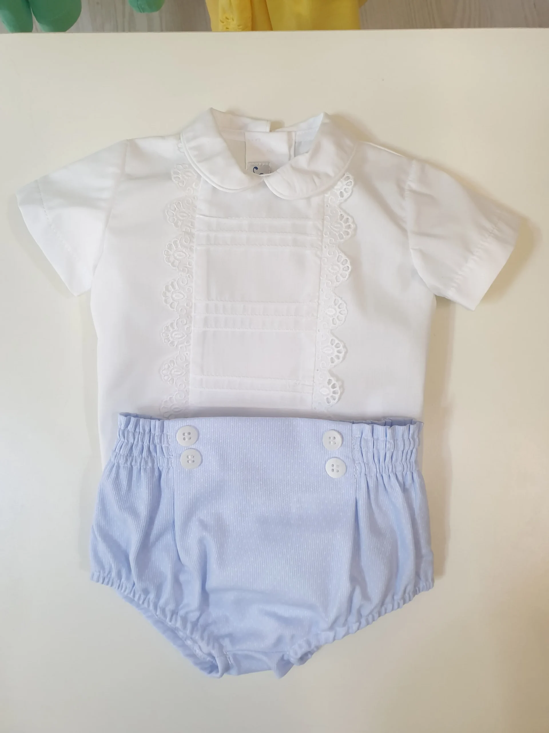Conjunto de dos piezas con camisa de manga corta y cubrepañal celeste con elástico y botones decorativos.