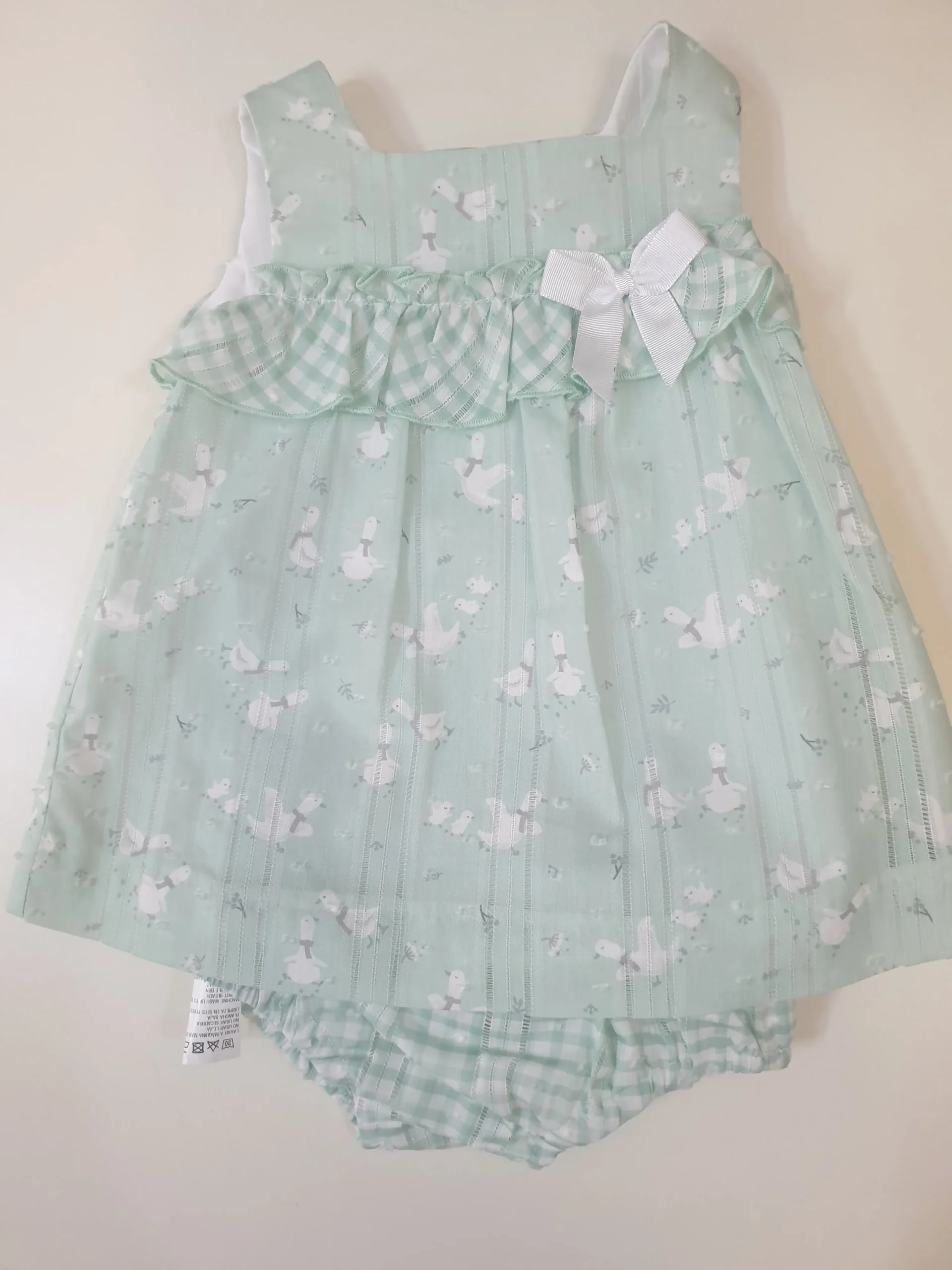 Vestido verde con detalle de volante y lazo. Ranita a juego con el volante.